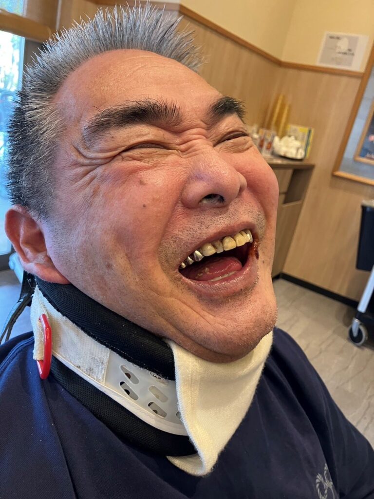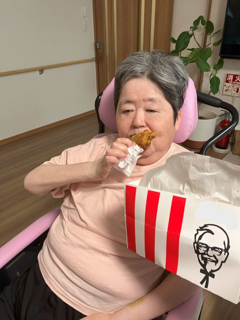 お土産のチキンを夕食に頬張られ、「うん、おいしか、ありがとう」と食べられていました。