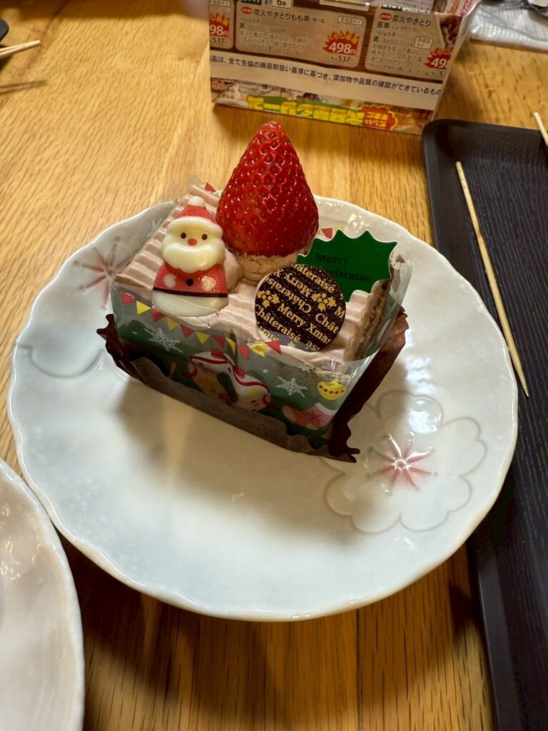 焼き鳥のオードブルとショートケーキでした。